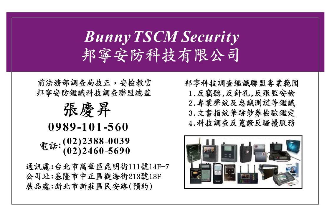 關於邦寧安防科技鑑識調查聯盟 是我國內目前真正唯一來自政府國安調查單位專精(反竊密.反針孔.反竊聽監控) ,(文書.指紋.筆跡.聲音.鑑定),(忠誠測謊檢驗),(司法諮詢.犯罪調查) 的真正專家教官團隊之調查鑑識聯盟 BunnytSecurity & Forensic Identification Group.(以下版權所有,文句敘述及圖片,翻錄必究)