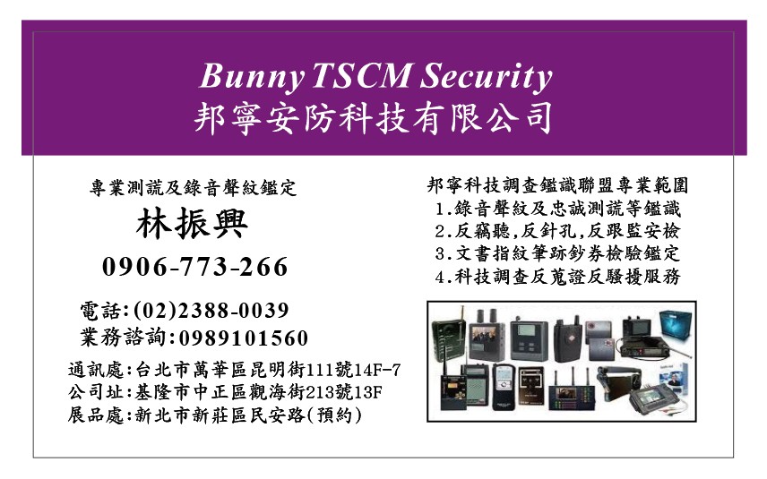 關於邦寧安防科技鑑識調查聯盟 是我國內目前真正唯一來自政府國安調查單位專精(反竊密.反針孔.反竊聽監控) ,(文書.指紋.筆跡.聲音.鑑定),(忠誠測謊檢驗),(司法諮詢.犯罪調查) 的真正專家教官團隊之調查鑑識聯盟 BunnytSecurity & Forensic Identification Group.(以下版權所有,文句敘述及圖片,翻錄必究)
